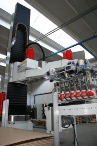 The MASTER type machine palletises packed products coming out from production line. Its main specification is the possibility to serve several production lines simultaneously even with different sizes. This palletiser is able to handle boxes, wrapped packages, cases and bags by picking them up in lines or in whole layer. It is specifically designed for very high speed production lines.